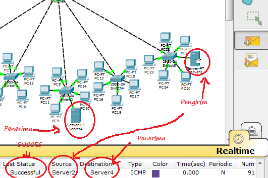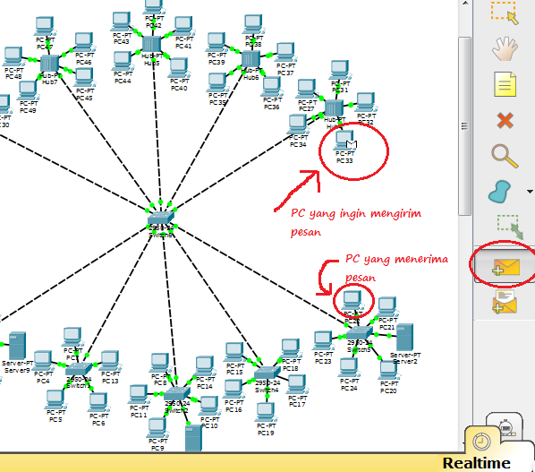 Setelah semua PC dan server diisi alamat, maka kita dapat mengirim dan menerima pesan antar PC atau antara PC dengan server, begitu juga dengan server dapat mengirim atau menerima pesan antar Server atau antara server dengan PC. Jika semua alamat telah terisi dengan benar maka saat mengirim pesan ke salah satu PC akan muncul kata Succesful. Adapun cara mengirim pesan adalah, klik gambar seperti amplop warna kuning yang terdapat di sebelah kanan papan kerja. Setelah itu, klik PC atau server yang ingin mengirim pesan, dan klik PC atau server yang ingin di kirim pesan. Lihat pada gambar di bawah ini :