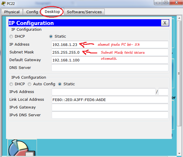 Kita telah selesai menyusun rangkaian Toplogi star dengan menggunakan Cisco Packet Tracer. Saatnya kita membuat IP Addresnya agar ruangan-ruangan tersebut dapat terhubung. Cara membuat alamatnya hanya mengklik PC yang akan dimasukkan alamat dan pilih Dekstop kemudian pilih IP Configuration. Setelah itu masukkan alamatnya, maka saat kita tekan enter Subnet Masknya akan terisi secara otomatis. Untuk Default Gateway, perlu diisi saat kita menggunakan Router. Namun jika kita menggunakannya walaupun dalam rangkaian ini kita tidak memakai Router, itu tidak menjadi masalah.