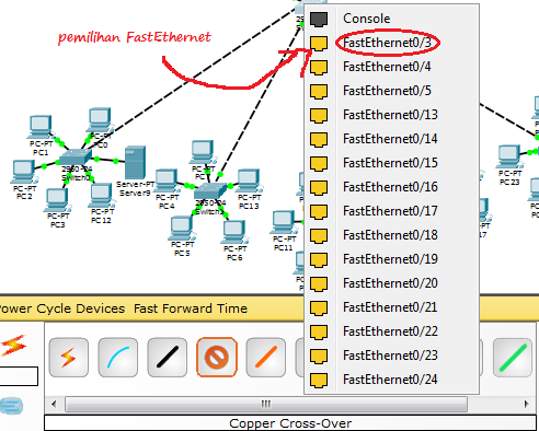 Dalam hal ini kami menggunakan FastEthernet0/5 untuk switch yang pertama dan setelah di klik pilihlah FastEthernet0/3. Jika telah terhubung, maka lakukan penghubungan ke semua switch dan Hubs. Berikut ini adalah gambar untuk pemilihan FastEthernet saat kita mengklik switch yang pertama.