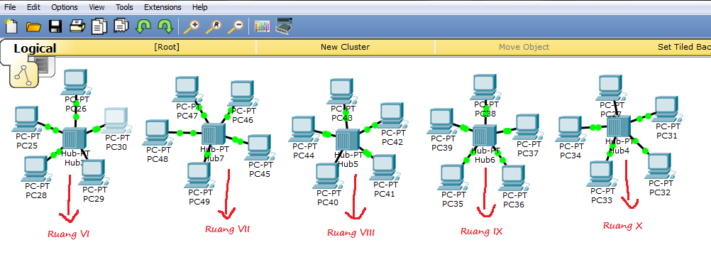 Jika port telah dipilih, maka lanjutkan ke PC berikutnya. Sampai semua PC terhubung ke Hubs dan membentuk sebuah ruangan baru. Kemudian lanjutkan pembuatan ruangan sampai ruangan mencapai 5 dan PC mencapai 25. Lihat pada gambar di bawah ini :