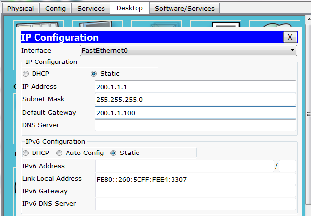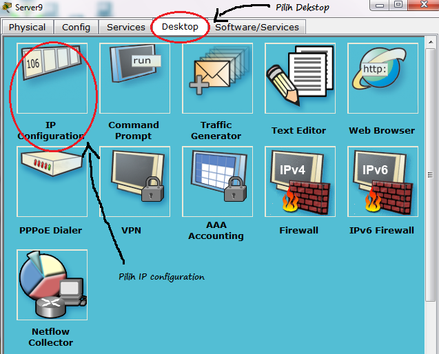 Pada pemberian alamat pada server sama saja dengan pemberian alamat pada PC. Pertama klik server yang akan diberi alamat, kemudian pilih dekstop, dan pilih IP Configuration. Berikut ini adalah urutan pembuatannya.