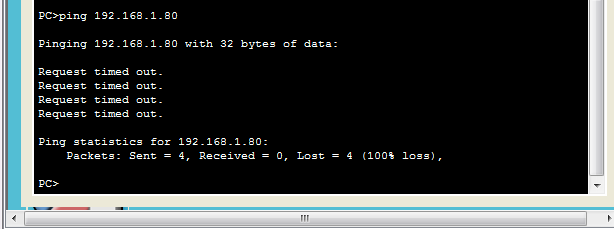 Tampilan menjadi begitu karna alamat 192.168.1.80 tidak ada pada rangkaian yang telah kita buat. Demikian seterusnya. Setelah semua diuji dan semua menghasilkan replay berarti rangkaiannya telah sempurna.