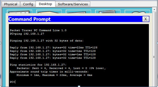 Kemudian masukan kata PING dan diikuti dengan alamat PC atau server yang dituju. Misalnya kita PING alamat 192.168.1.27 dan tekan enter maka hasilnya adalah seperti gambar di bawah ini :