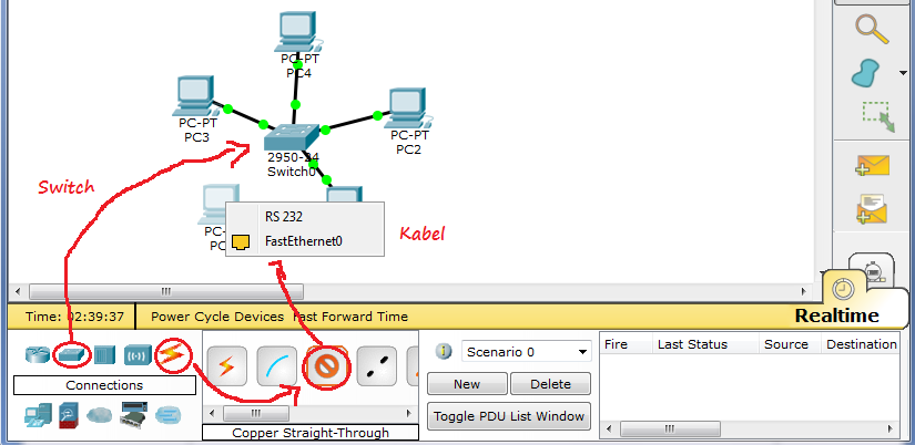 Jika ada pilihan saat menghubungkan PC ke switch, gunakan Fastethernet() dan sambungkan ke switchnya dengan memilih FastEthernet0/1 jika pada PC yang pertama, begitu selanjutnya sampai PC ke lima secara berurutan.