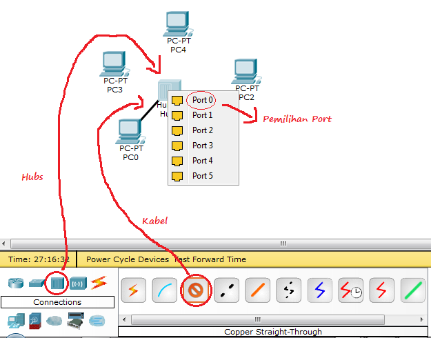 Pada penghubungan PC dengan Hubs sama dengan penghubungan PC dengan Switch. Perbedaannya hanya terletak pada pemilihan saat meng-klik Hubsnya. Pada penghubungan PC dengan Hubs ini, kita akan memilih Port 0. Lihat pada gambar di bawah ini :