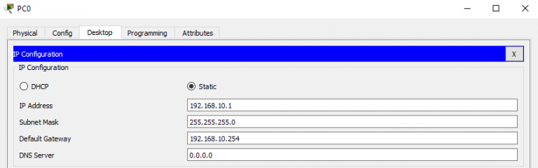 Default Gateway : 192.168.10.254 (IP Address dari Router0 interface fa0/0 vlan 10)